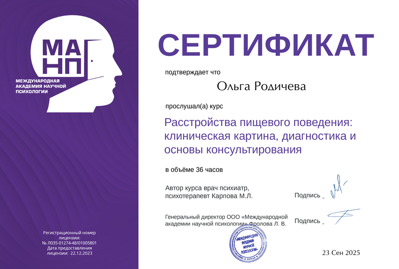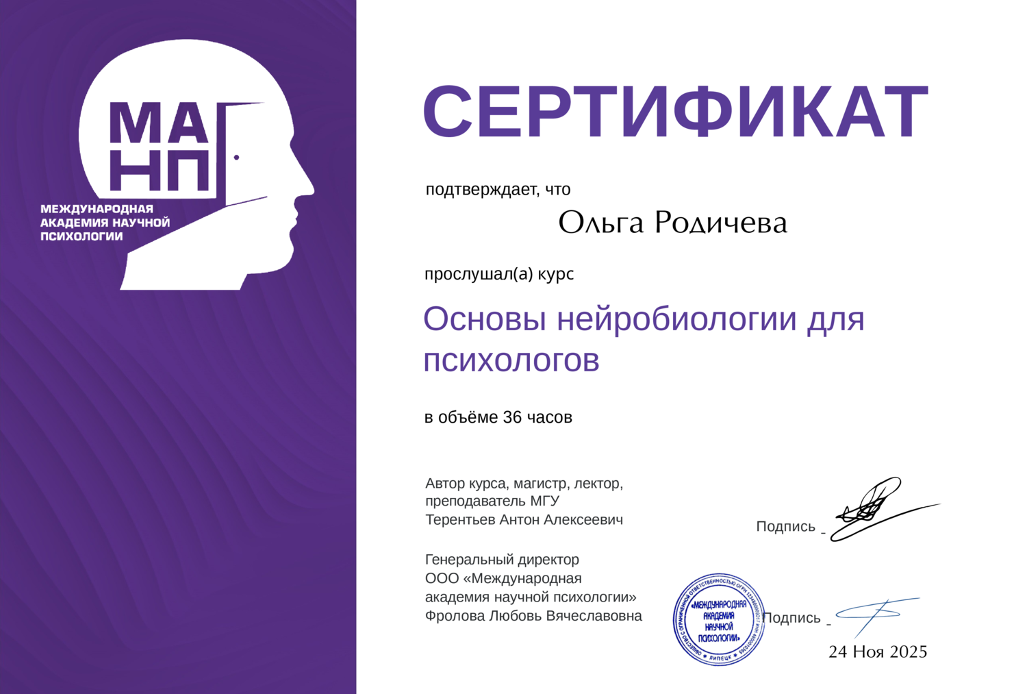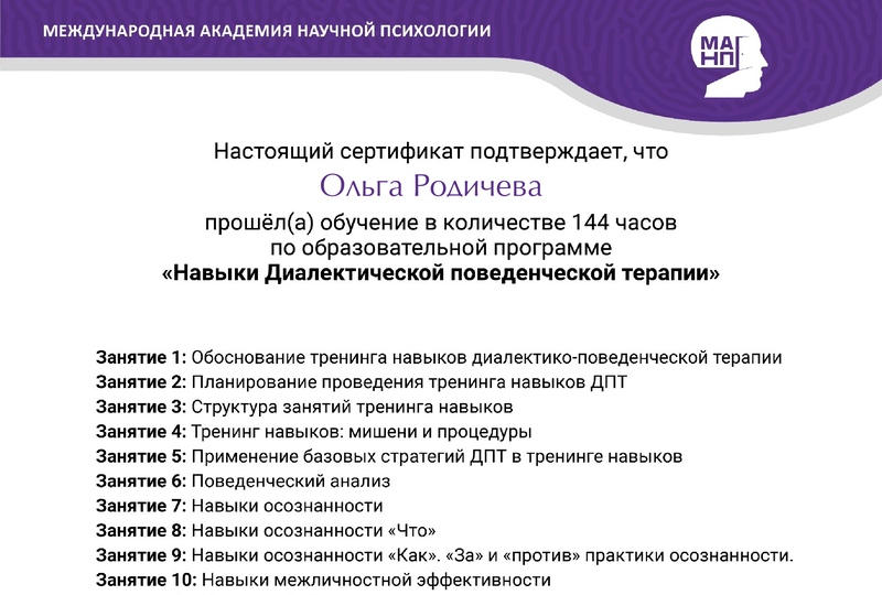 В психологию я вернулась с рождением третьего ребенка. Прошла специализацию по КПТ (базовый и продвинутый курсы и КПТ детей и подростков) и курс по РЭПТ, большой курс в МГУ по терапии принятием и ответственностью (ACT) тренерский курс mindfulness, базовые курсы по схематерапии и CFT, курс по перинатальной психологии, начала историю с DBT и продолжаю постоянно учиться. Получила образование консультанта по гв, сну и уходу.